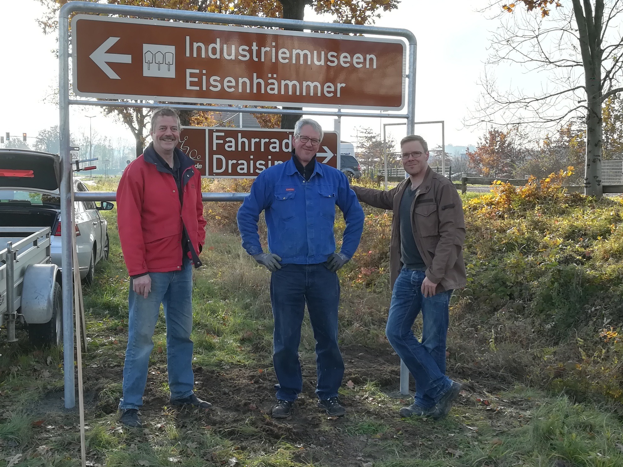 Nach längeren Wegen zur Genehmigung und zur Lieferung der Hinweisschilder sind diese jetzt an der Extertalkreuzung (leider erst nach dem Saisonende) aufgestellt worden. Beim Aufstellen haben Kevin Lee Potter und Wolfgang Ehrich mit geholfen, sowie Vera Vöge und Joachim v. Meien. Entworfen wurden die Schilder von dem Vereinsgrafiker Christoph Ehleben. Die Erstellung der Schilder wurde mit 500,- € von der Schaumburger Landschaft unterstützt.