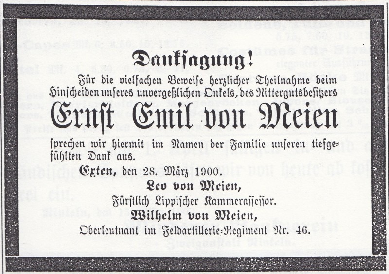 „Exten, 20. März 1900 Ernst Emil von Meien +. Gestern Morgen 11 Uhr erlöste ein sanfter Tod von schweren Leiden auf seinem Rittergute Exten Ernst Emil von Meien. Der Heimgegangene ist in seinem Leben nicht viel an die Öffentlichkeit getreten, wohl aber hat er an der Verwaltung des Kreises – dem Kreistage der Grafschaft gehörte er ununterbrochen seit Einführung der Kreisordnung an – stets regen Antheil genommen. Der Vorsitzende des Kreisausschusses, Herr Landrat von Ditfurth widmet ihm heute nachstehenden Nachruf: „Sein liebenswürdiges, offenes Wesen gewann ihm alle Herzen und sein scharfer praktischer Verstand, sowie seine genaue Kenntnis aller Verhältnissse des Kreises Rinteln machten ihn zu einem werthvollen Mitarbeiter in der Kreisverwaltung. Sein Andenken wird in Ehren bei uns fortleben.“